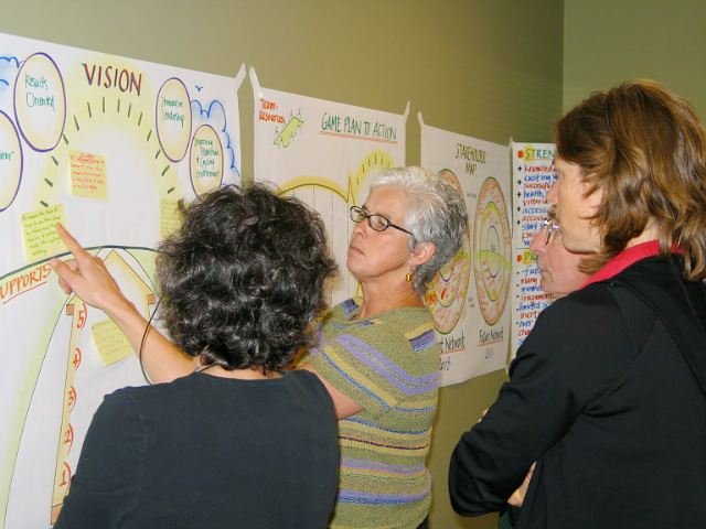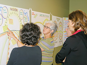 Large scale graphic recording is usually done live at a meeting or conference. Some of these work examples include meetings working with a facilitator, in a few cases Deborah has worked as both facilitator and recorder. Strategic/planning sessions and conferences are the most common venue for using graphic recording. Custom chart work is done outside the meeting venue and will summarize decisions and direction that group has determined to follow.