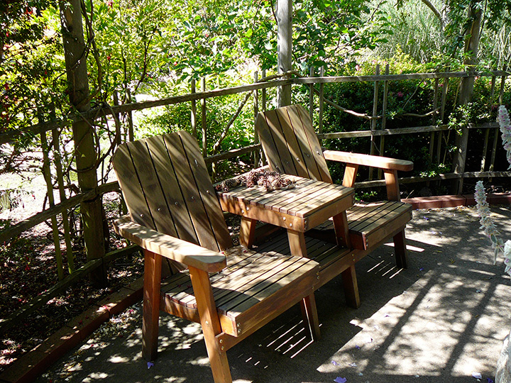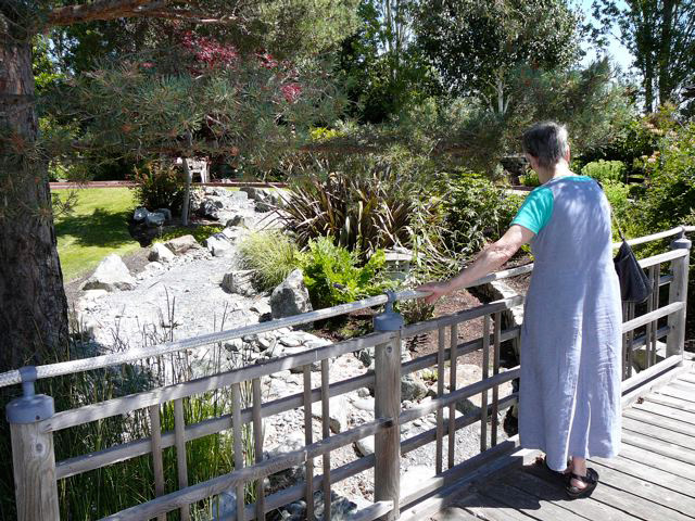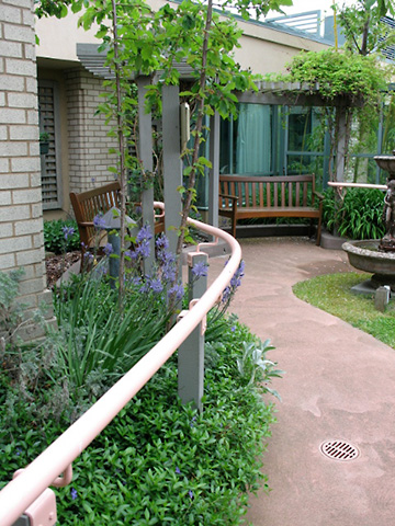 The gardens at this facility are designed for residents with significant levels of dementia. These residents can move easily from indoors to the garden through two automated main access doors. Raised planted beds and an clothes line provide motivation and activity when outdoors. Seating areas in semi-shade environments keep residents comfortable.