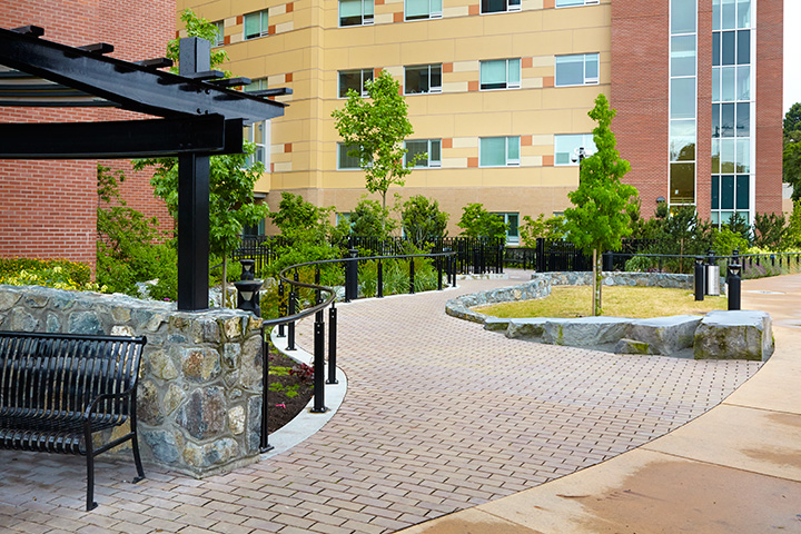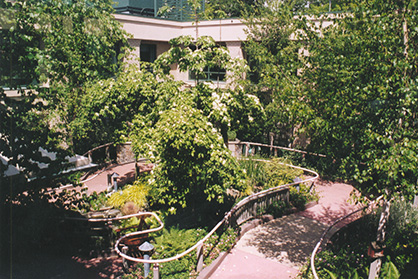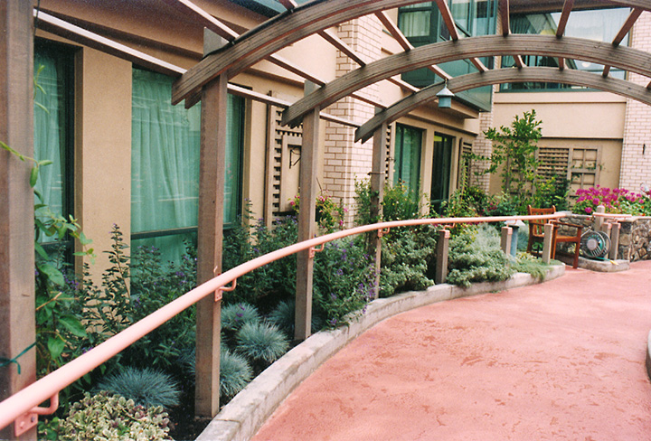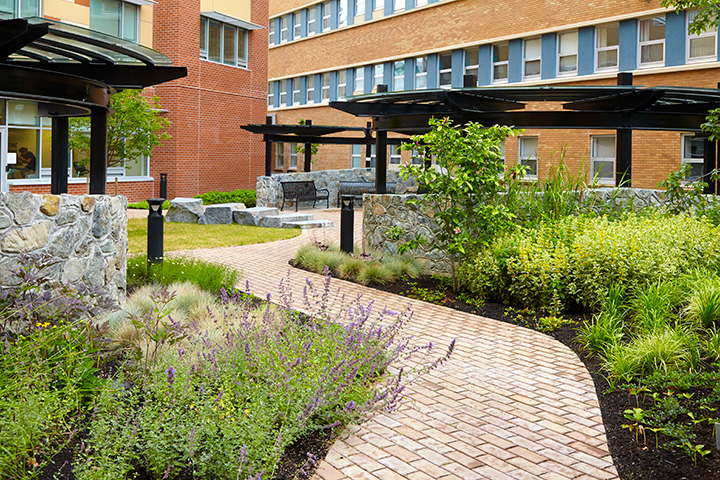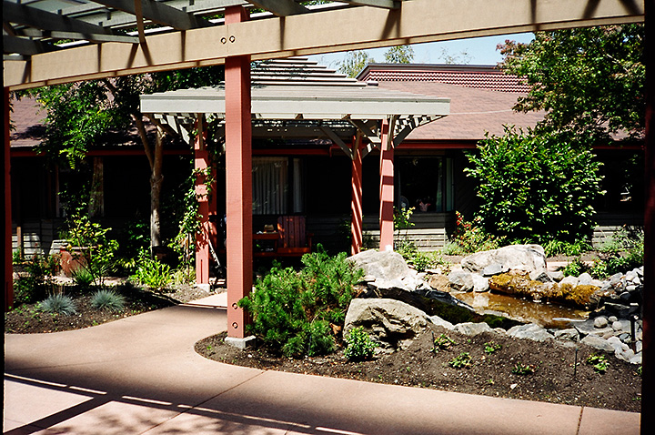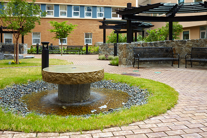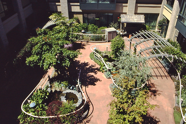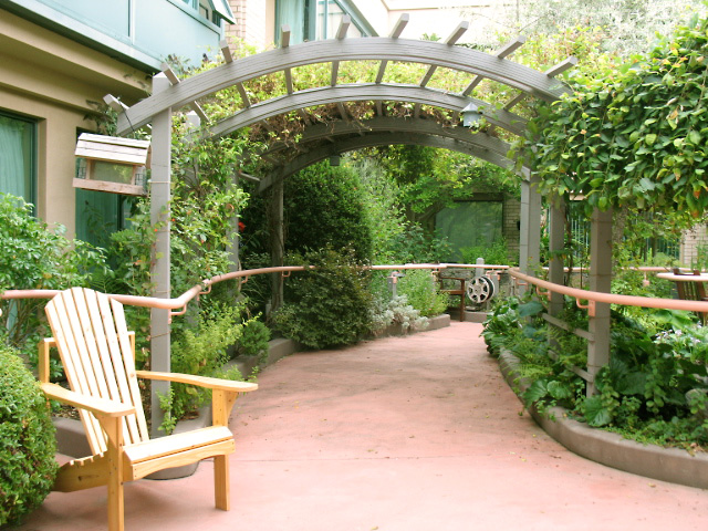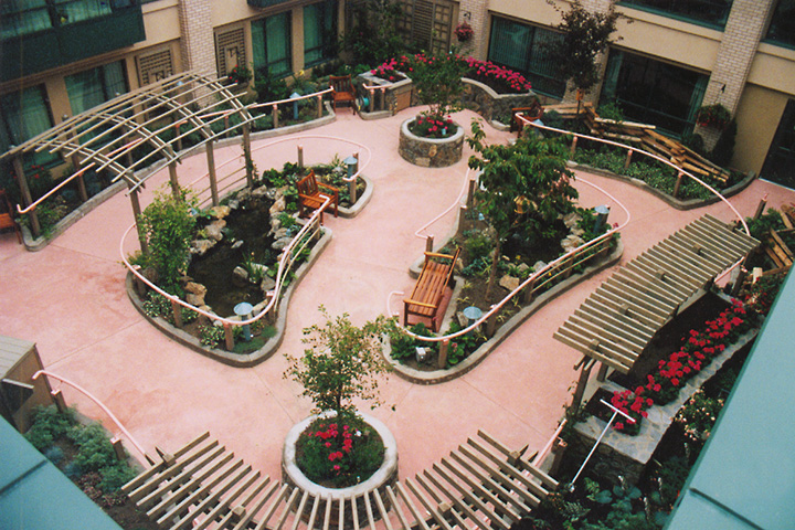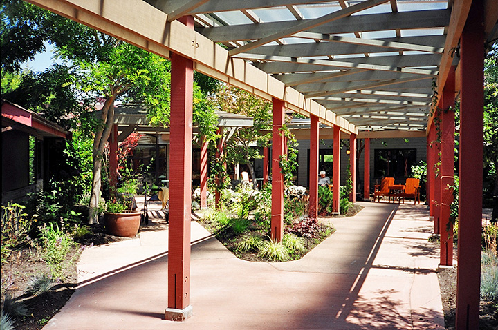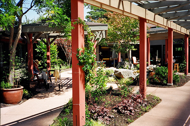 Nine accessible courtyards nurture the souls of residents who live there. Shade structures, raised planters, non-toxic plants that evoke memories, sculptures for interest and wayfinding are some of the details incorporated into this facility.