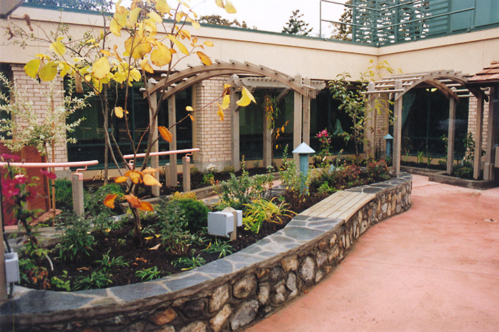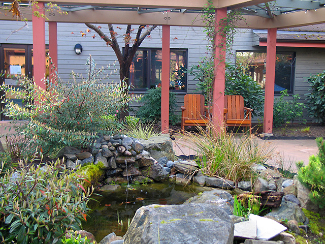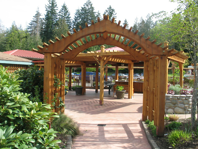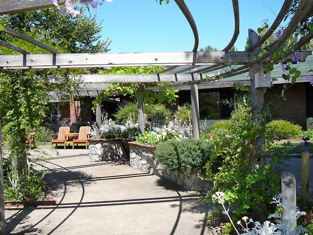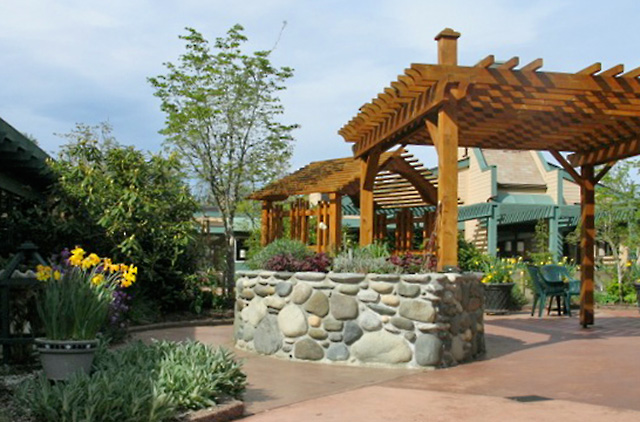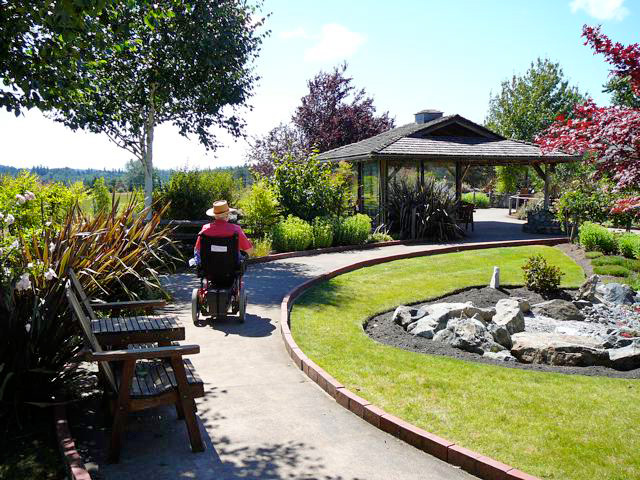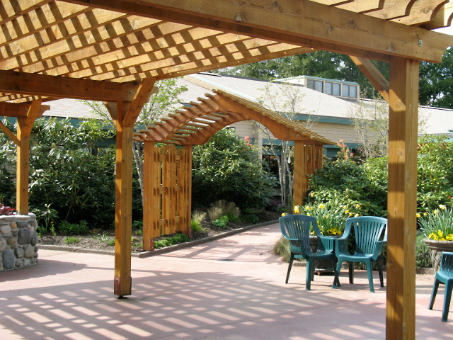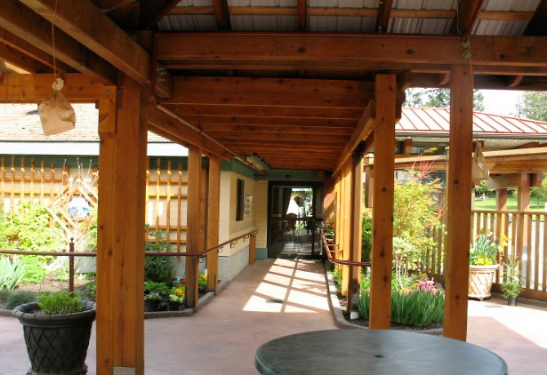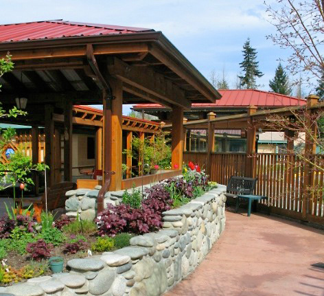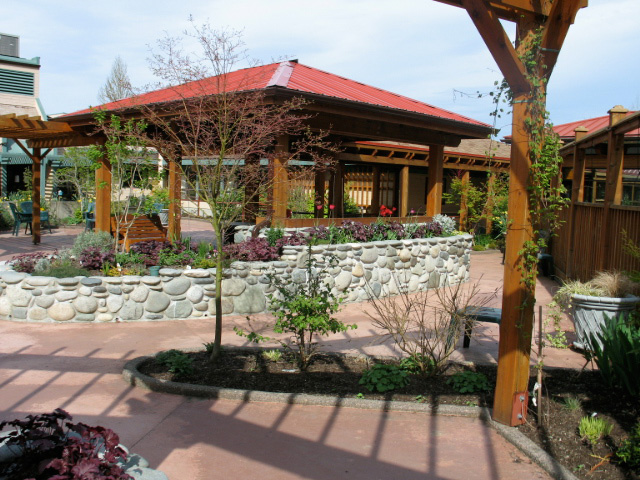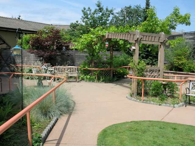 Parksville residential care facility with best garden entrance structure that provides weather protection from the building into the garden gazebo. Pathway system leads to private seating areas and garden structures that support resident wayfinding.
