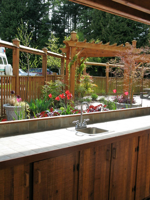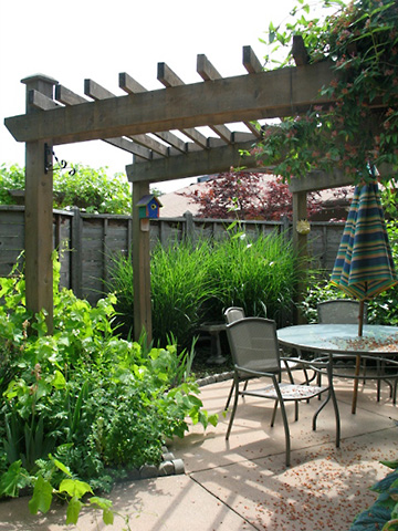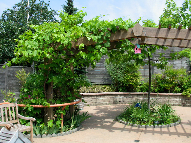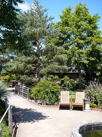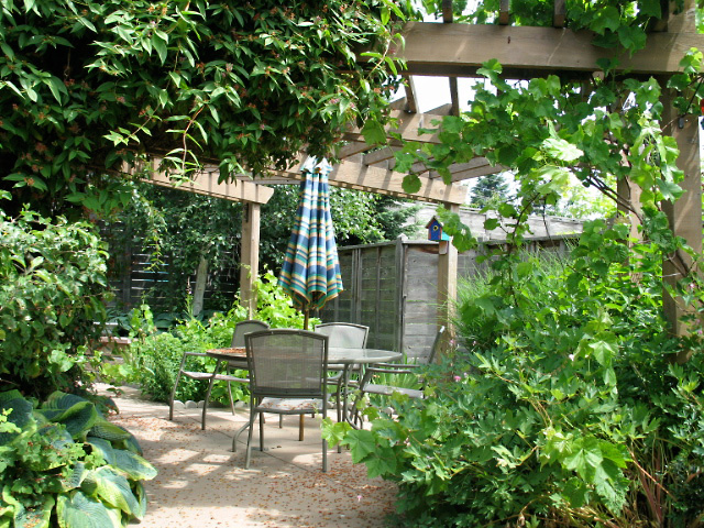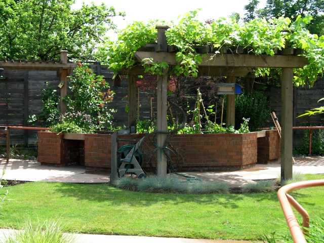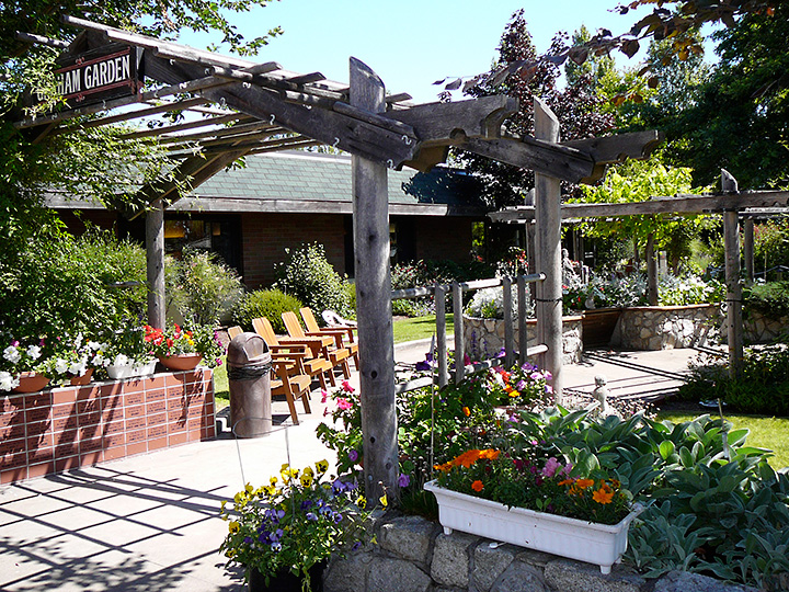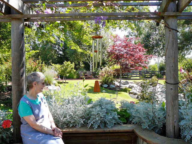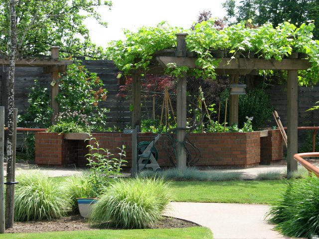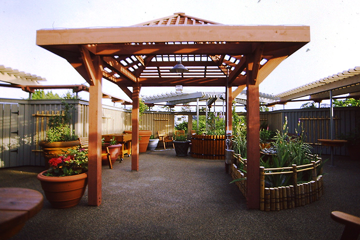 Parksville residential care facility with best garden entrance structure that provides weather protection from the building into the garden gazebo. Pathway system leads to private seating areas and garden structures that support resident wayfinding.